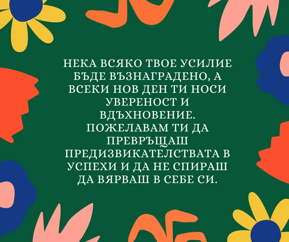 Да откриваш възможности дори там, където другите виждат пречки. Нека трудът ти бъде оценен, а резултатите – гордост за теб и вдъхновение за другите.